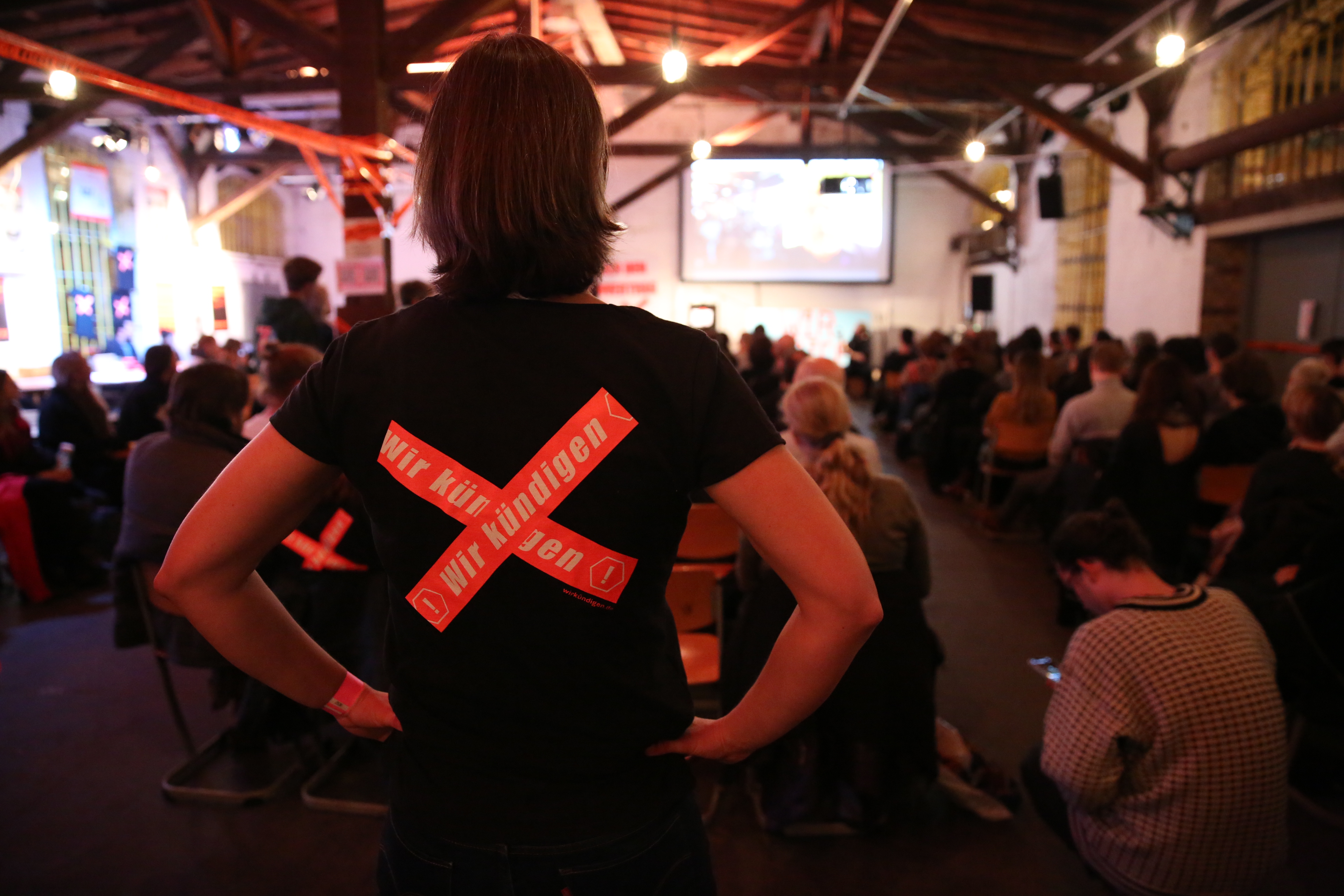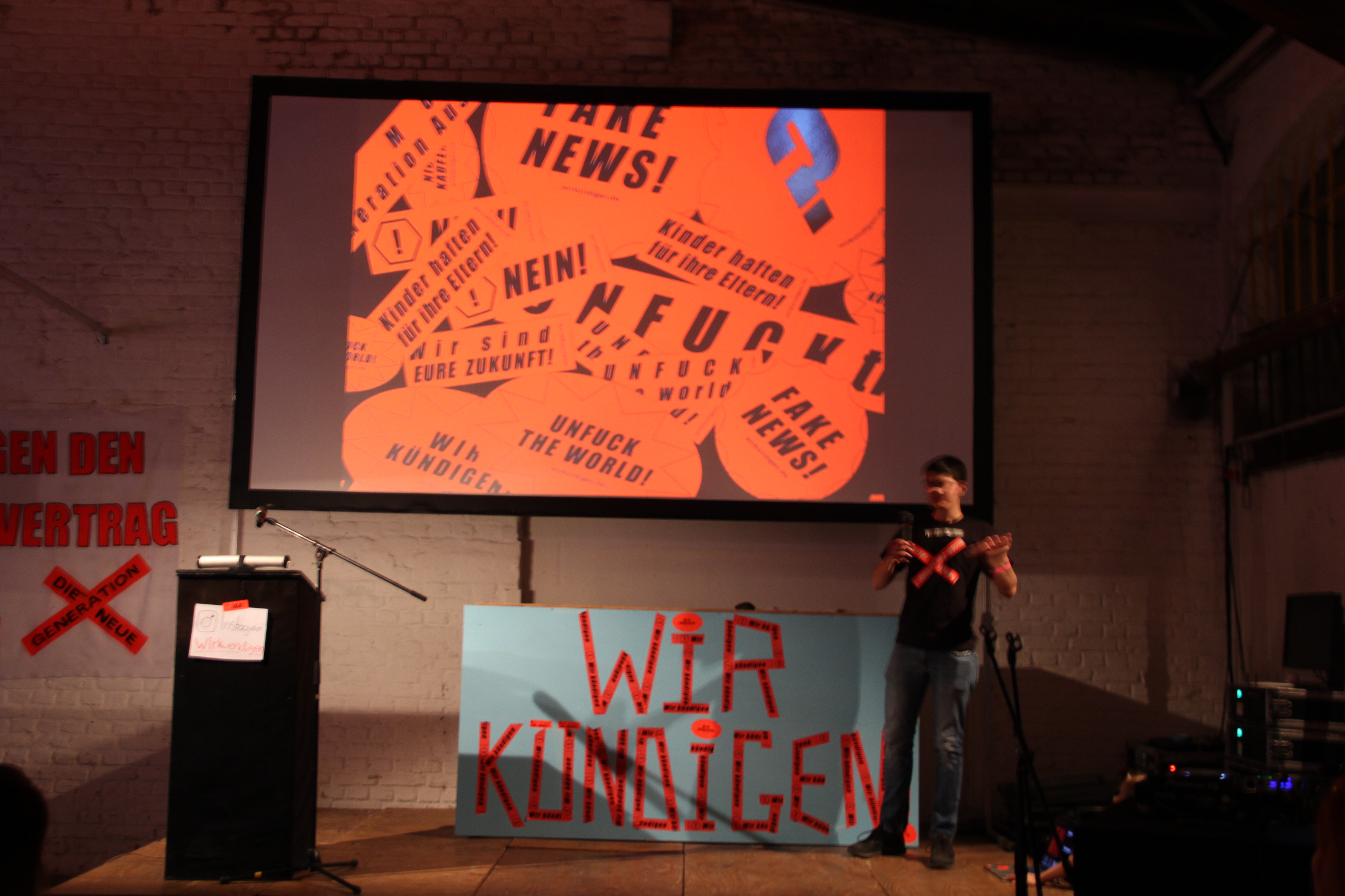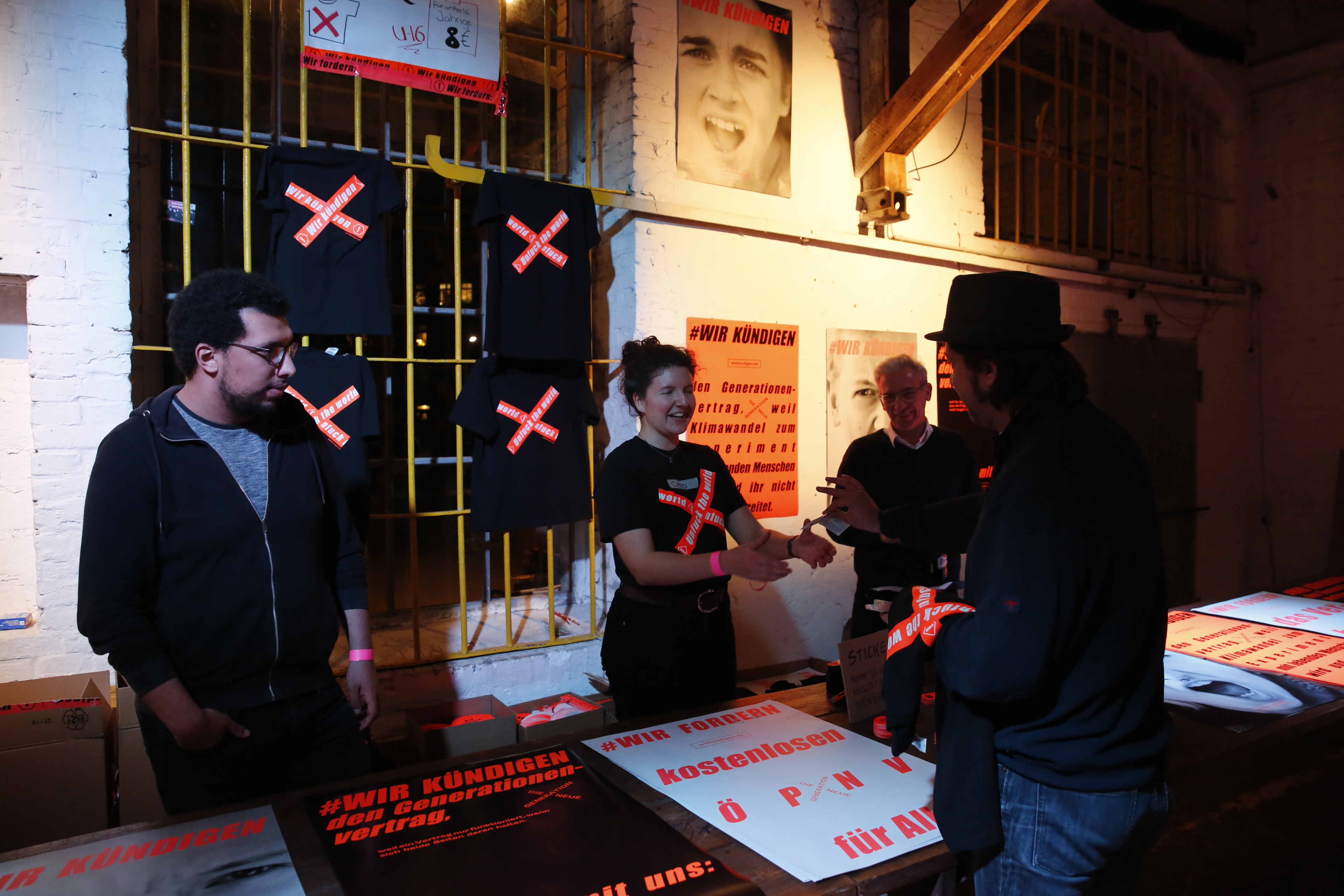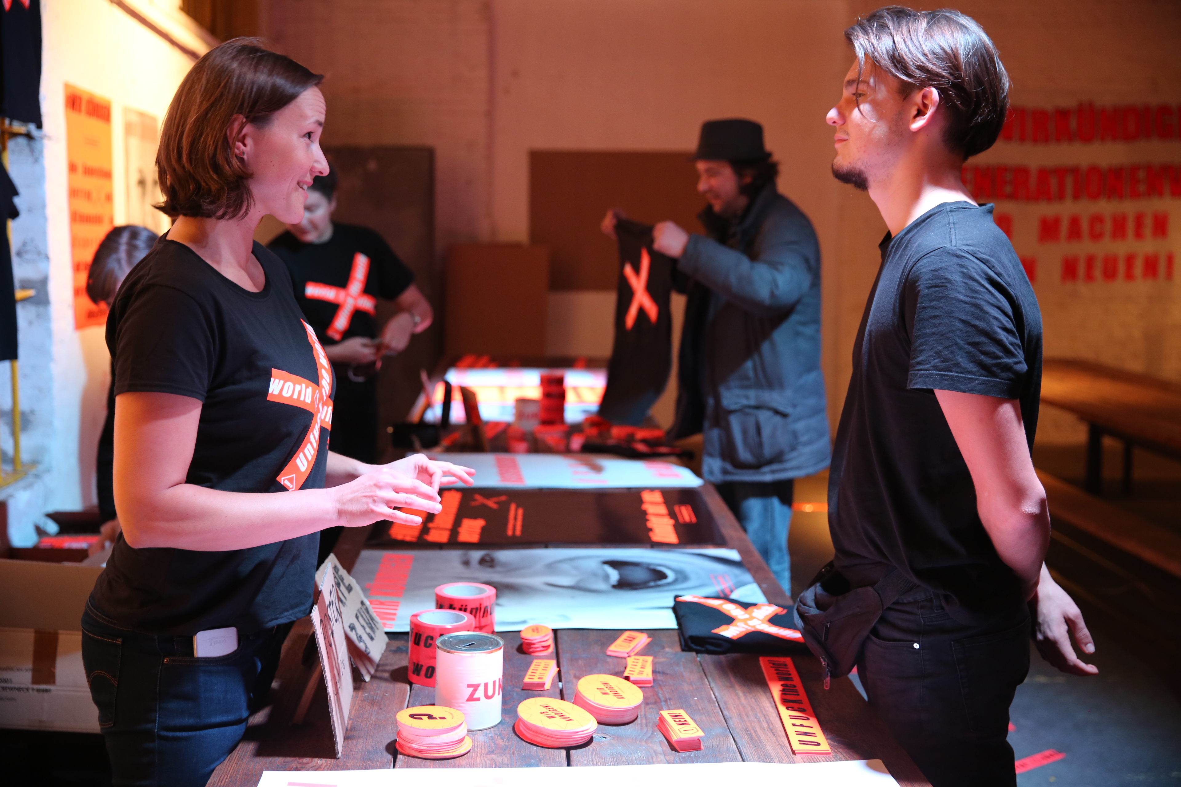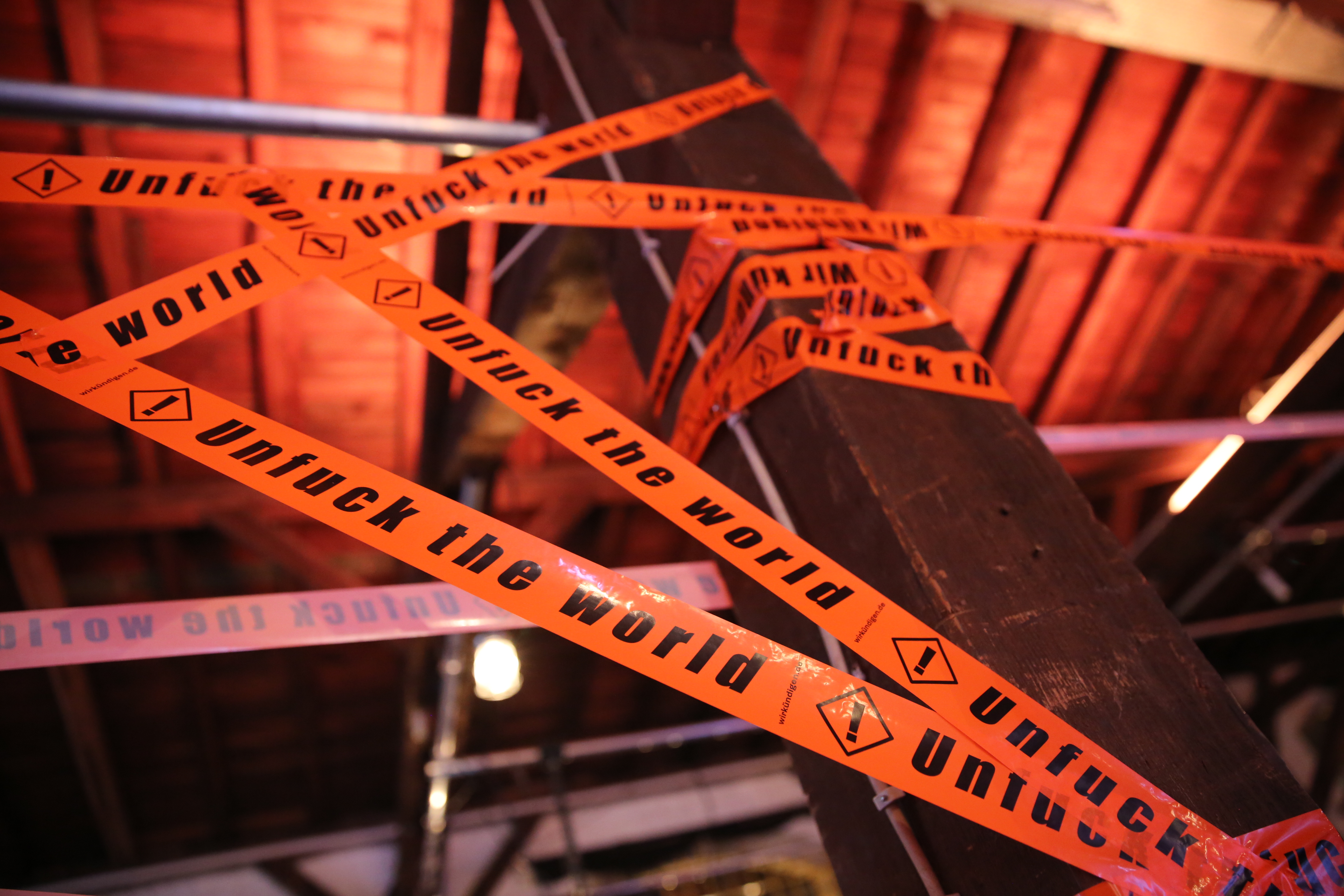 Unser Auftakt fand in den Hallen des Z/KUs statt. Schon von draußen waren wir nicht zu übersehen, Straßen, Autos und Tore wurden zugetaped – so konnten uns alle finden. In den Hallen leuchtete alles in Neon Orange. Unsere Plakate bestückten die Wände. Jede freie Fläche wurde mit dem „Wir kündigen“ und „Unfuck the world“ Tape eingenommen.